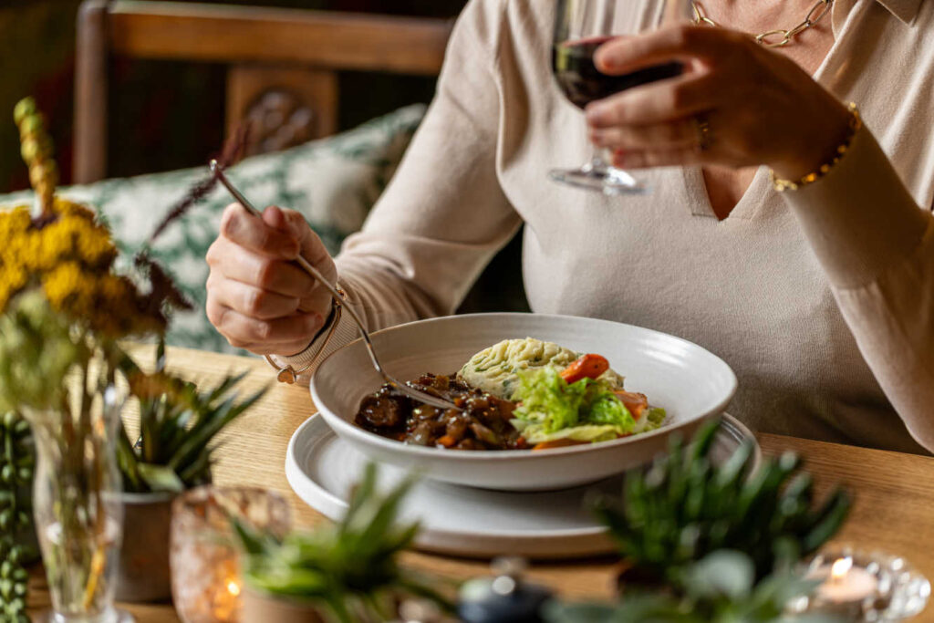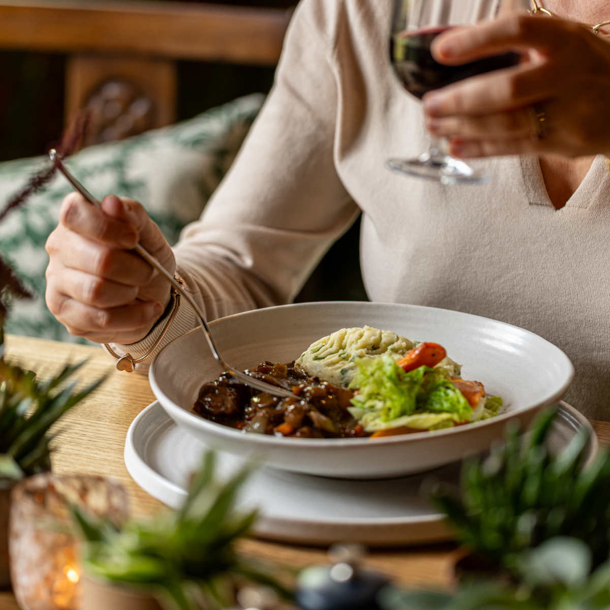 Highland venison casserole, herby mash, buttered greens, roasted carrots 645 kcals